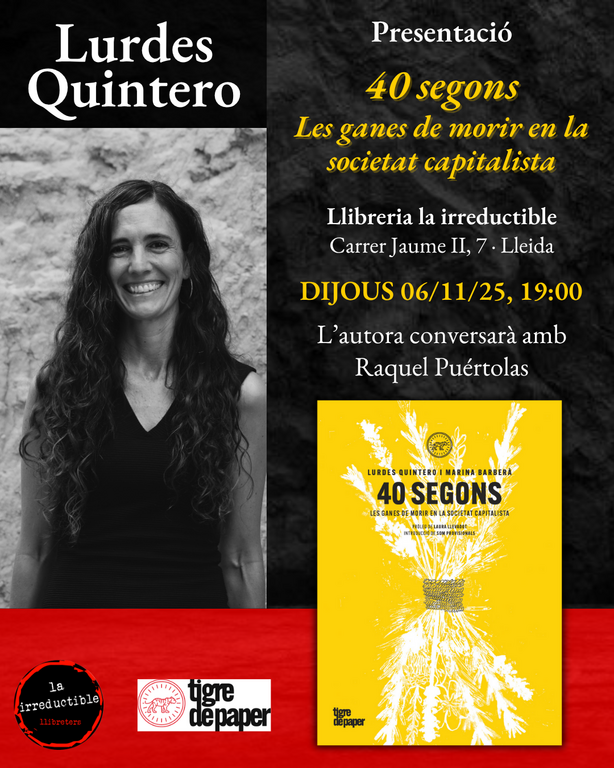 Presentacions Presentació del llibre '40 segons. Les ganes de morir en la societat capitalista' Amb l’autora, Lurdes Quintero, qui conversarà amb Raquel Puértolas