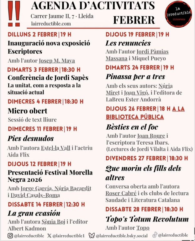 Exposicions · Conferències · Presentacions Activitats de la Irreductible del mes de febrer Exposicions, conferències, presentacions i micro obert durant tot el mes