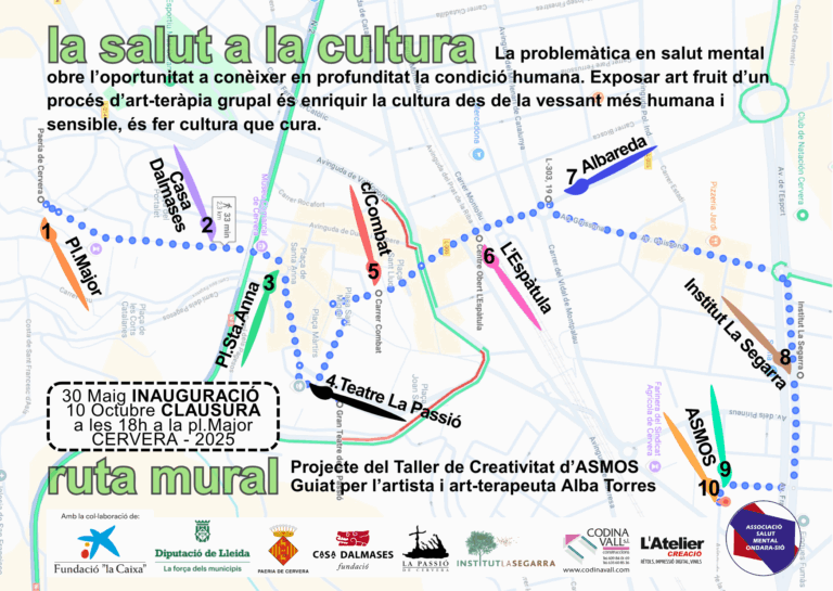 A la vegada que dona a conèixer ASMOS, aquesta exposició pretén donar veu a la salut mental, visibilitzant-ne la problemàtica de forma pedagògica i desmuntant el seu estigma. L’exposició es podrà trobar temporalment a diversos murs de Cervera configurant una ruta de 10 obres murals que van des del la Pça. Major fins a la seu d’Asmos.