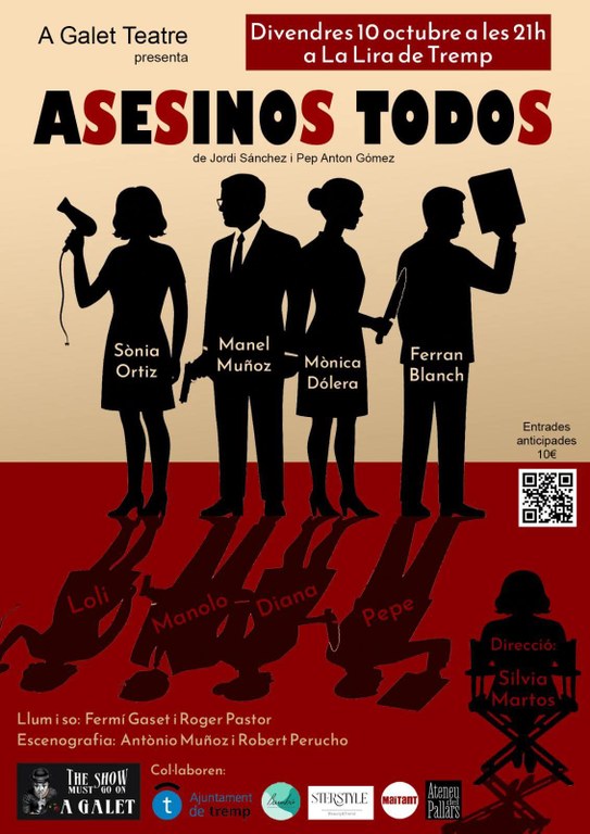 Asesinos todos és una comèdia negra escrita per Jordi Sánchez i Pep Antón Gómez que retrata, amb humor àcid i molta ironia, la frustració quotidiana. Quatre personatges —tres amics i una esposa— comparteixen les seves misèries i arriben a una conclusió tan absurda com inquietant: potser l’única manera de resoldre els seus problemes és eliminar a qui els causa. Amb diàlegs enginyosos i situacions delirants, l’obra ofereix una crítica divertida a les relacions personals, la doble moral i la banalització de la violència. Estrenada el 2020 amb Carlos Sobera, Neus Asensi, Elisa Matilla i Ángel Pardo, ha fet gira per escenaris de tot l’Estat amb gran èxit de públic.