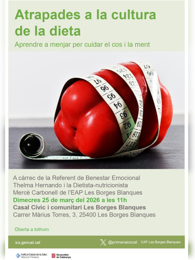 Xerrada oberta a tothom per reflexionar sobre la cultura de la dieta i adquirir eines per relacionar-nos amb l'alimentació d'una manera més saludable, respectuosa i conscient.