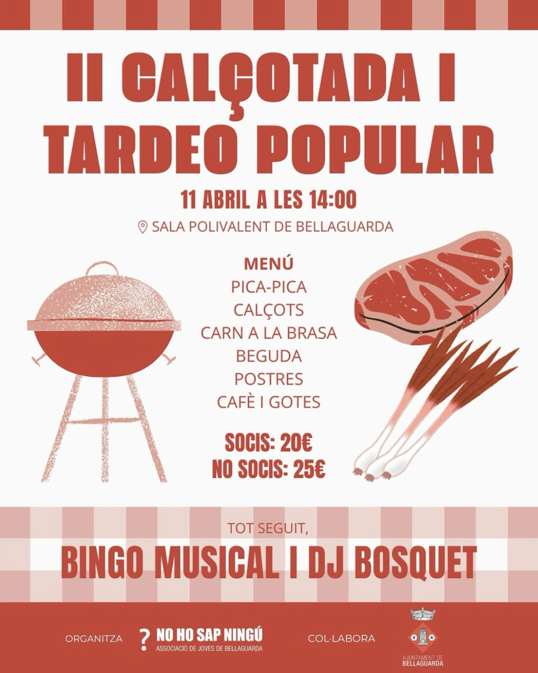 14:00 h – Inici de la II Calçotada i tardeo popular a la Sala Polivalent de BellaguardaMenú: pica-pica, calçots, carn a la brasa, beguda, postres, cafè i gotesTot seguit – Bingo musical i sessió amb DJ Bosquet