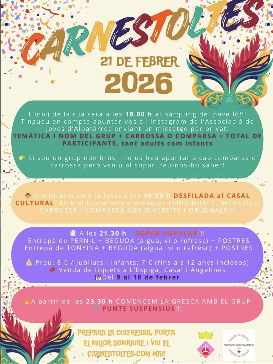 Inscripcions per Instagram de l’Associació de Joves d’Albatàrrec (missatge privat amb: temàtica, nom del grup, carrossa o comparsa i total de participants).