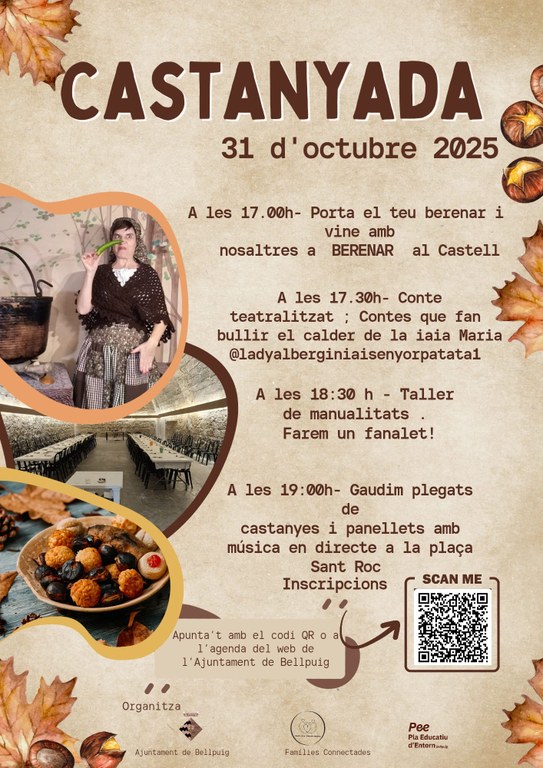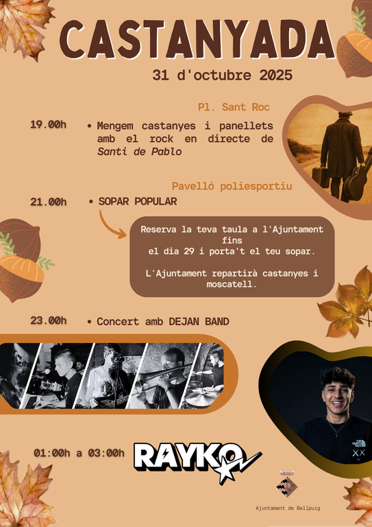 21.00 h – Sopar popular al pavelló poliesportiu. Cal reservar taula a l’Ajuntament abans del dia 29 i portar el propi sopar. L’Ajuntament repartirà castanyes i moscatell.