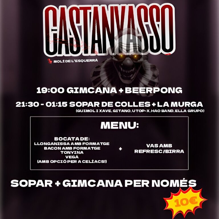19.30 h | Gimcana i Beerpong21.30 h | Sopar de collesTot seguit | Concert amb La Murga, Guimol i Xave, Lo Gitano de Balaguer, Utop-X, Hao Band i Ella Grupo01.15 h | Sessió amb DJs Tgsn i DJ Gallego