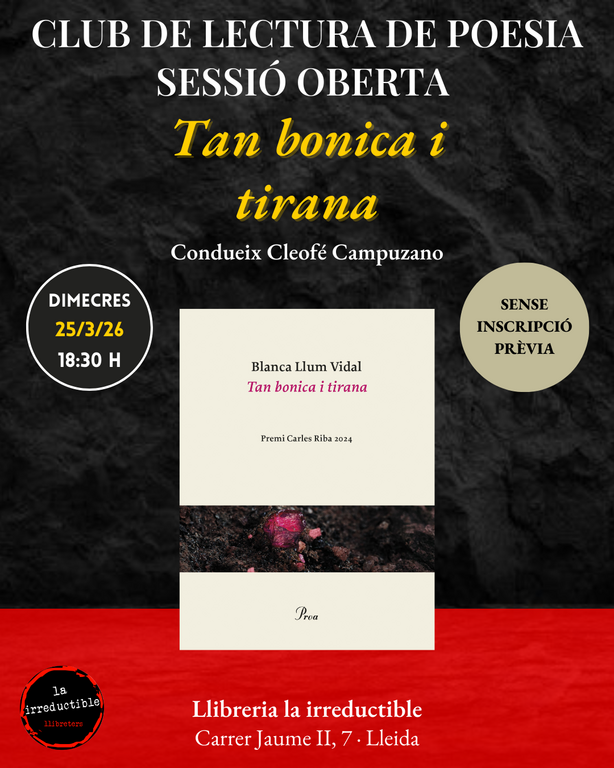 Club de lectura · Presentacions i col·loquis Club de lectura obert per parlar del poemari 'Tan bonica i tirana', de Blanca Llum Vidal Condueix Cleofé Campuzano