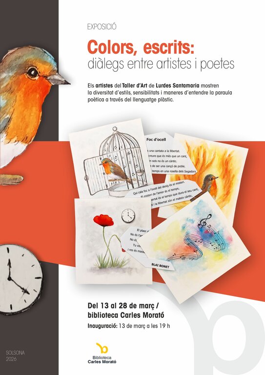 "Colors, escrits: diàlegs entre artistes i poetes" és el títol de l'exposició col·lectiva coorganitzada pel Taller d'Art de Lurdes Santamaria i la Biblioteca Carles Morató, una selecció d'obres pictòriques inspirades en les poesia que han captivat els artistes del taller.