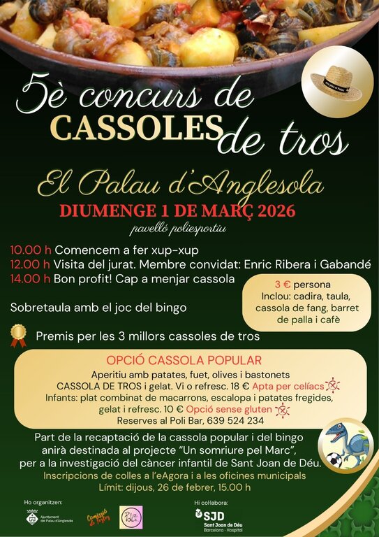 Part de la recaptació de la cassola popular i del bingo es destinarà al projecte “Un somriure pel Marc” per a la investigació del càncer infantil de Sant Joan de Déu.