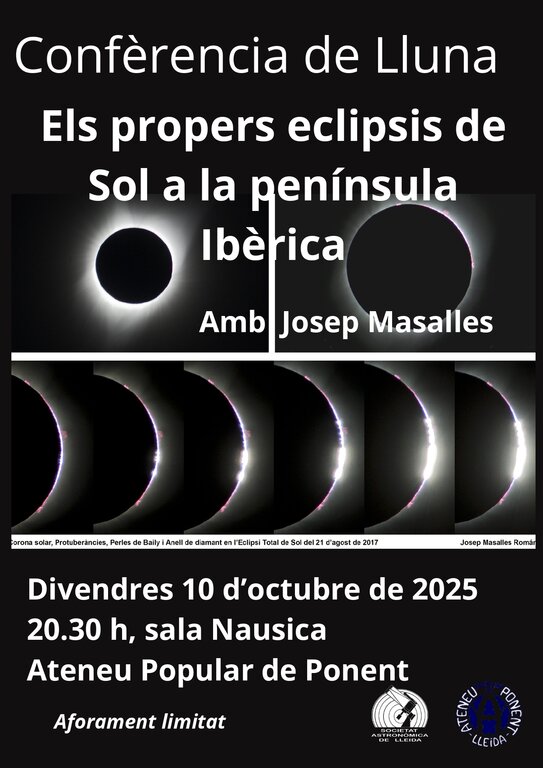 Conferències Conferència de Lluna: els propers eclipsis de sol a la península ibèrica A càrrec de Josep Masalles
