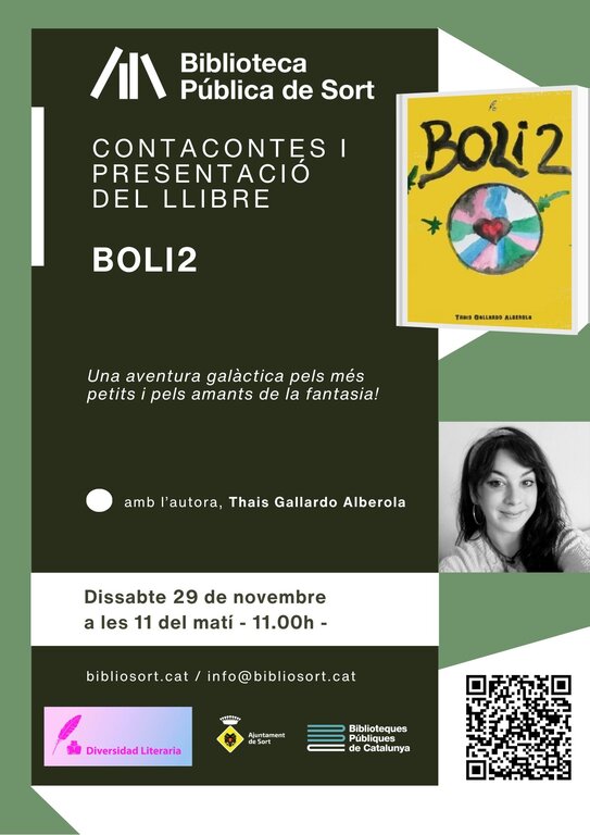 Activitats familiars · Cicles · Club de lectura · Contacontes · Presentacions · Trobada Contacontes i presentació del llibre 'Boli2', amb l'autora Thais Gallardo Alberola dissabte 29 de novembre. 11.00. Biblioteca Pública de Sort.