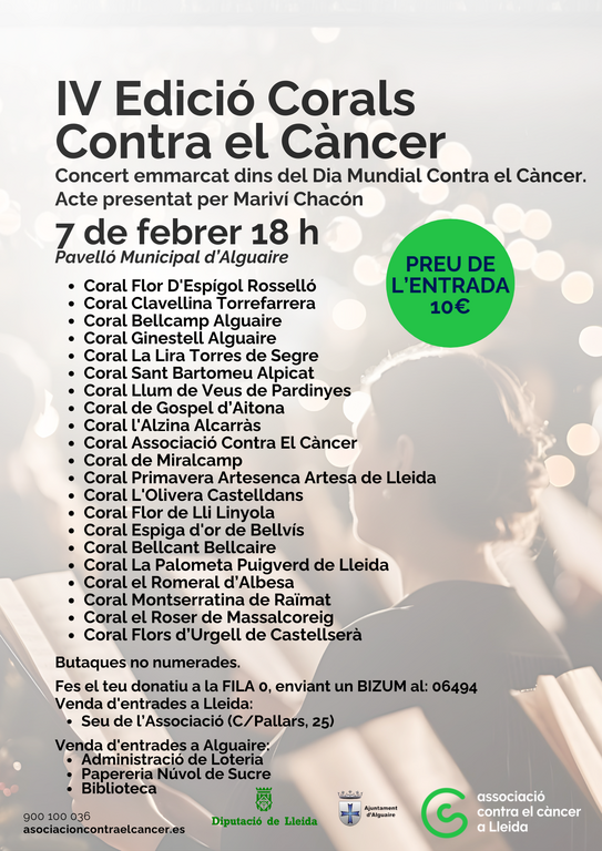 Participaran més de vint corals de la demarcació, entre les quals destaquen formacions d’Alguaire, Rosselló, Torrefarrera, Alcarràs, Alpicat, Aitona, Raimat, Puigverd de Lleida o Castellserà. Un esdeveniment que reuneix el teixit coral del territori per donar suport a la lluita contra el càncer.