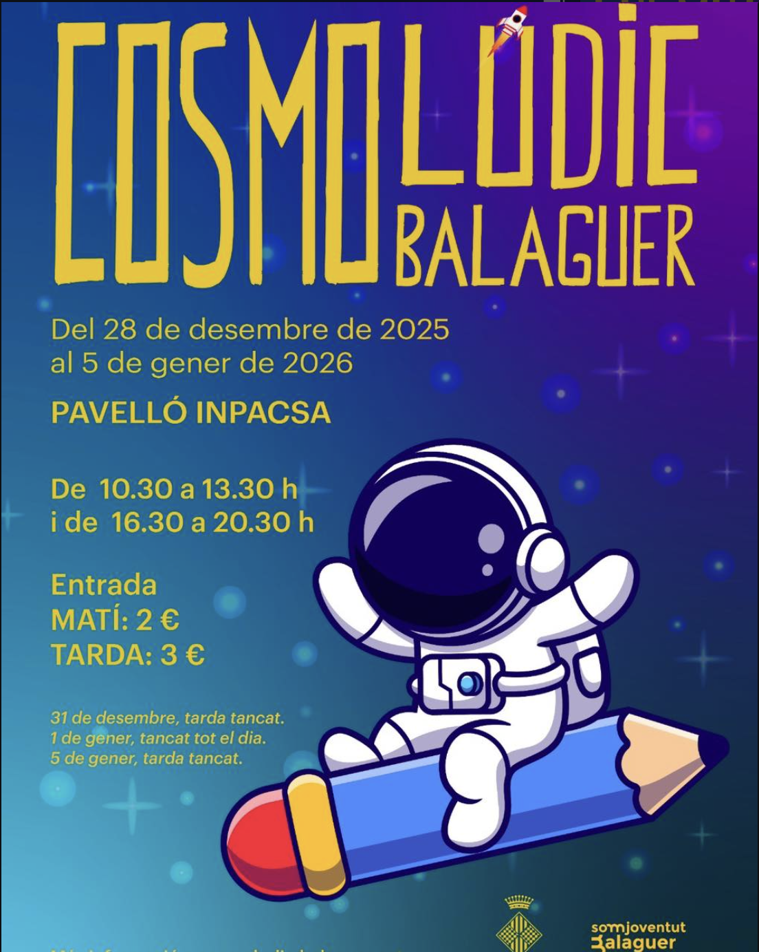 Cada any per vacances de Nadal, “Cosmolúdic”, el saló nadalenc de la Infància de Balaguer obre les seves portes, per tal d'oferir a les famílies amb nenes i nens d'entre 3 i 14 anys un seguit d'activitats lúdiques i pedagògiques.