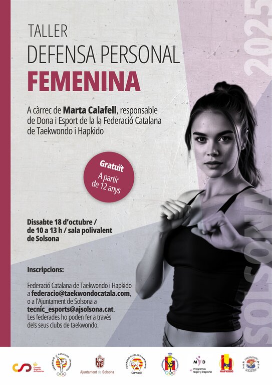 Aquest taller serà impartit per Marta Calafell, responsable del departament de Dona i Esport de la Federació Catalana de Taekwondo-Departament de Hapkido, mestra nacional d’ambdues disciplines, amb 7è dan de taekwondo i 6è de hapkido. L’organitza la federació amb la col·laboració de la regidoria d’Esports de Solsona i el club Taekwondo Solsona, entre d’altres.