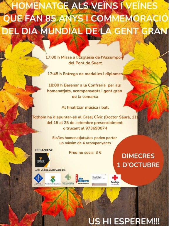 L'Associació de la Gent Gran de l'Alta Ribagorça celebrarà el Dia Mundial de la Gent Gran amb un homenatge als padrins i padrines que aquest any compleixen 85 anys. Una vida sencera plena d’experiències, esforç i estimació, que són el millor llegat per a les noves generacions.