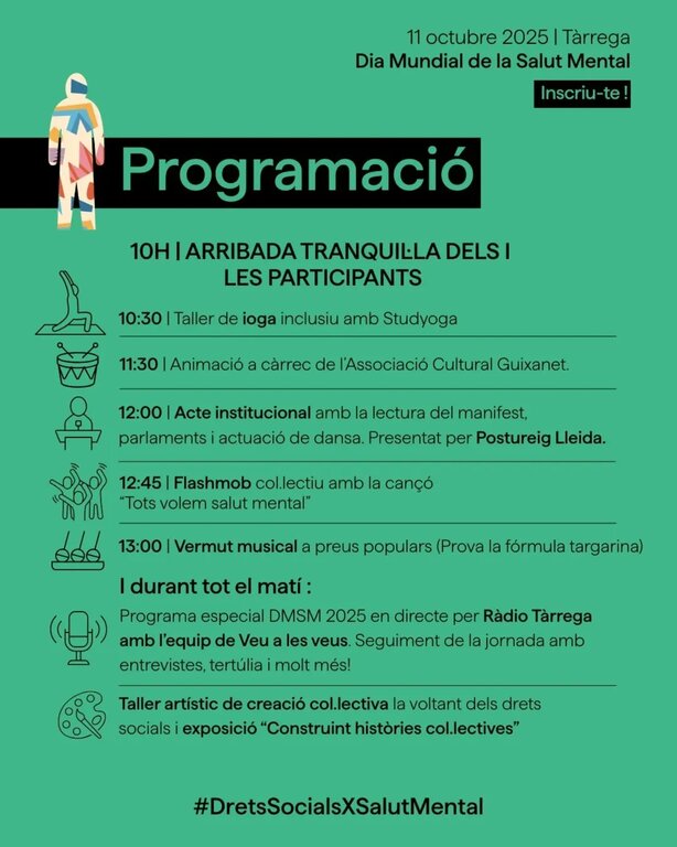 La celebració del Dia Mundial de la Salut Mental 2025 a Tàrrega vol posar de manifest que la salut mental és un dret humà fonamental i que només es podrà garantir si es garanteixen els drets socials essencials com l’habitatge, el treball digne, l'educació inclusiva, les cures i el suport comunitari.