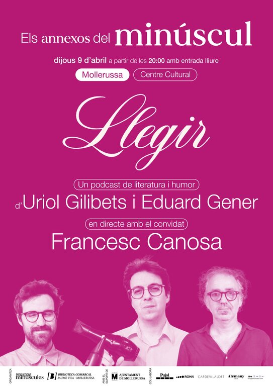El Centre Cultural de Mollerussa acull “Llegir”, un podcast en directe de literatura i humor dins el cicle Els annexos del Minúscul. L’activitat, amb entrada lliure, comptarà amb Oriol Gilibets i Eduard Gener, i tindrà com a convidat especial el periodista Francesc Canosa.