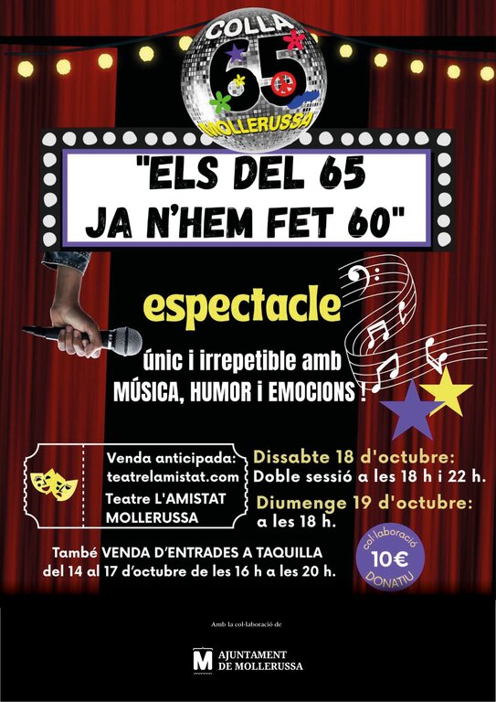 La Colla 65 de Mollerussa presenta l’espectacle Els del 65 ja n’hem fet 60, una proposta única i irrepetible que combina música, humor i emocions per celebrar els 60 anys dels nascuts el 1965. L’actuació tindrà lloc al Teatre L’Amistat de Mollerussa amb una doble sessió el dissabte 18 d’octubre, a les 18 h i a les 22 h, i una sessió més el diumenge 19 d’octubre a les 18 h.