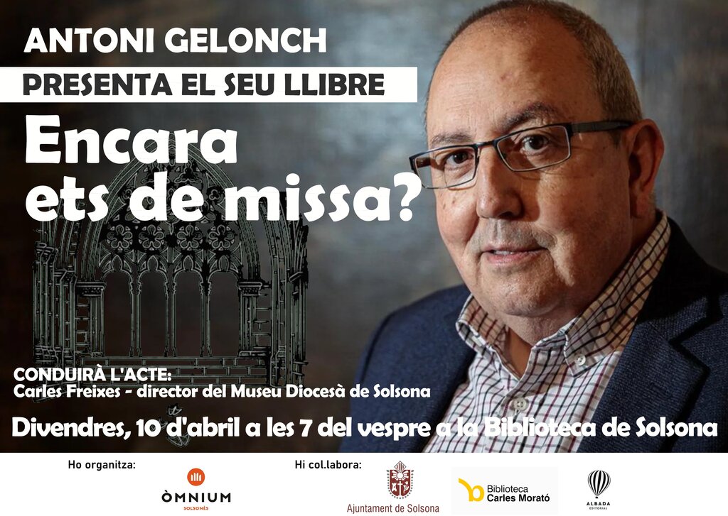 Antoni Gelonch torna a la biblioteca solsonina per presentar el seu darrer assaig, Encara ets de missa?, un llibre que vol donar resposta als qui llancen aquesta pregunta; arguments als qui dubten i als que volen enfortir la seva fe; i confirmació als qui comparteixen una resposta afirmativa, i dóna respostes als que cerquen. L'acte consistirà en una conversa amb el director del Museu de Solsona, Carles Freixes.