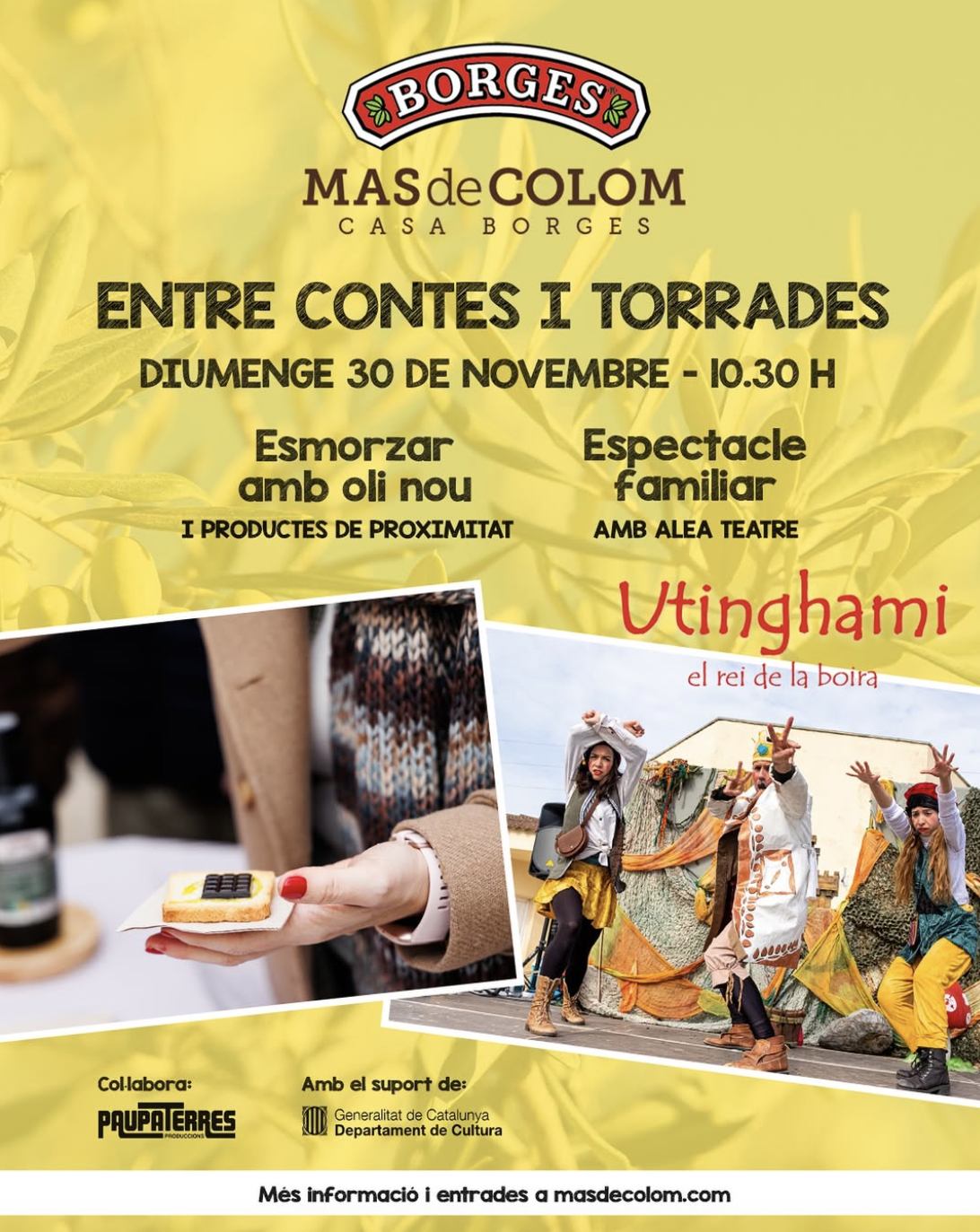 Mas de Colom - Casa Borges et convida a passar una estona amb família per gaudir de la cultura! De la mà d’Alea Teatre, la companyia d’arts escèniques de Cervera, arriba l’espectacle Utinghami: la història de l’Eulàlia i les seves peripècies per aconseguir trobar la pedra de la llum de la imaginació, que la vella bruixa Pèrfida ha robat als nens i nenes del poble. A més, hi haurà foodtruck (no inclòs al preu de l'entrada) tant abans de l’espectacle com en acabar, hi podràs degustar en exclusiva -entre altres coses- la nova producció 2025 d’oli verge extra Mas de Colom! Fruit de la collita en verd en el seu punt òptim per garantir la màxima intensitat de frescor i aroma! Un cupatge exclusiu de la finca a partir de varietats seleccionades d'arbequina i verdiell.