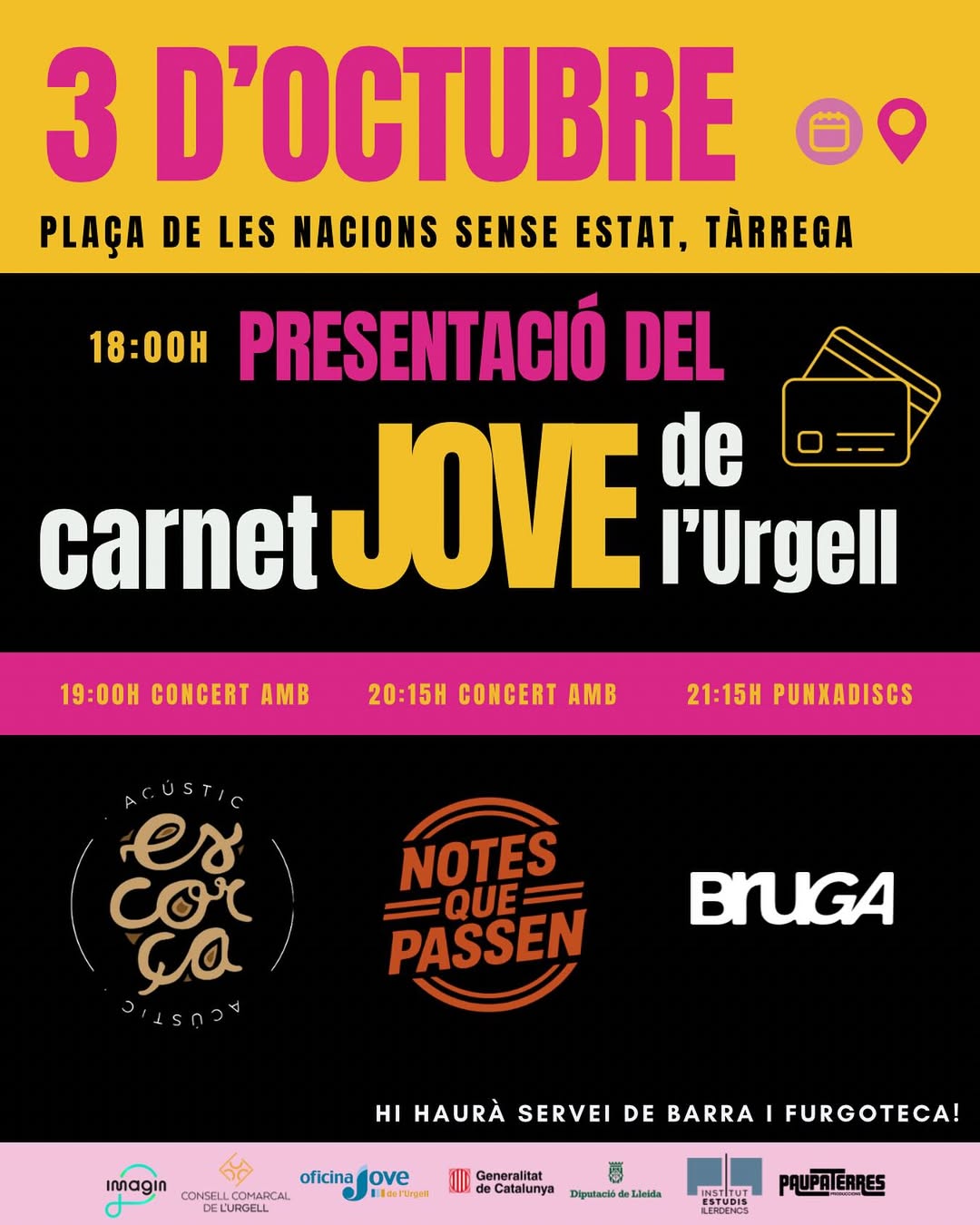 L'Oficina Jove de l'Urgell presenta el nou CARNET JOVE DE L’URGELL, un projecte pensat per apropar avantatges i oportunitats al jovent de la comarca. A partir de les 6 de la tarda es farà la presentació oficial i l'esdeveniment continuarà amb diverses actuacions musicals. Amb barra i menjar a càrrec de l’Associació Paupaterres.