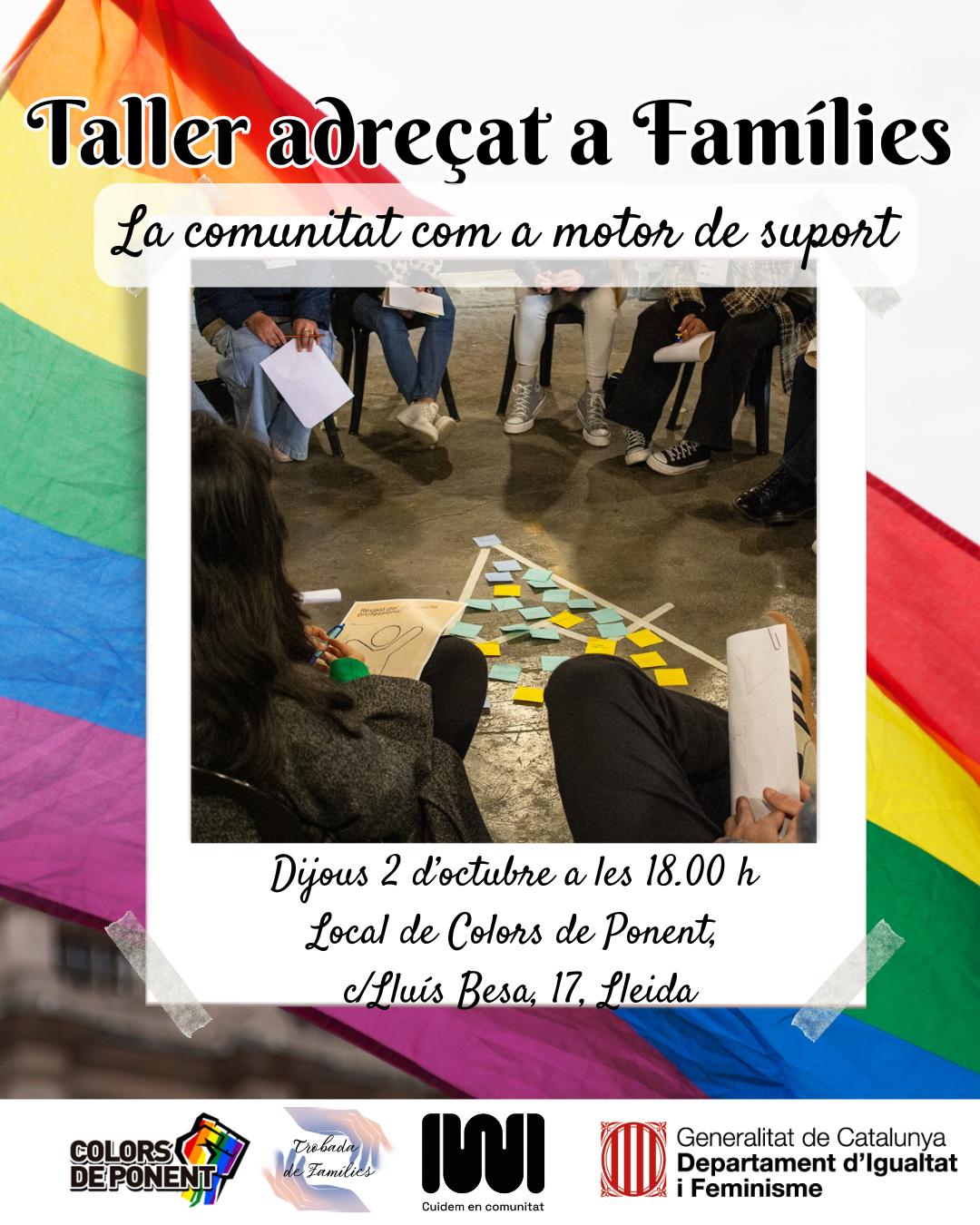 Activitats familiars · Trobada · Tallers Espai de diàleg per a famílies: la comunitat com a motor de suport Organitzat per l'Associació Colors de Ponent, col·lectiu LGBTIQ de Lleida