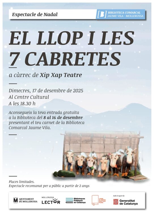 Activitats familiars · Festes nadalenques · Nadal · Espectacle · Teatre Espectacle de Nadal ' El llop i les 7 cabretes ', a càrrec de Xip Xap Teatre 17 de desembre. 18.30. Mollerussa.