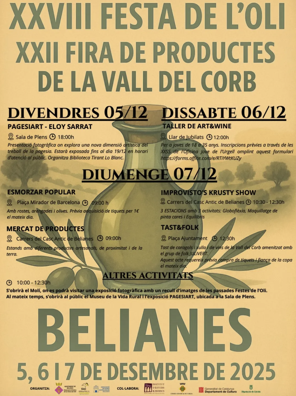 De 10.00 a 12.30 h s’obre el Molí, amb una exposició fotogràfica de Festes de l’Oli anteriors. També obren al públic el Museu de la Vida Rural i l’exposició PagesiArt.