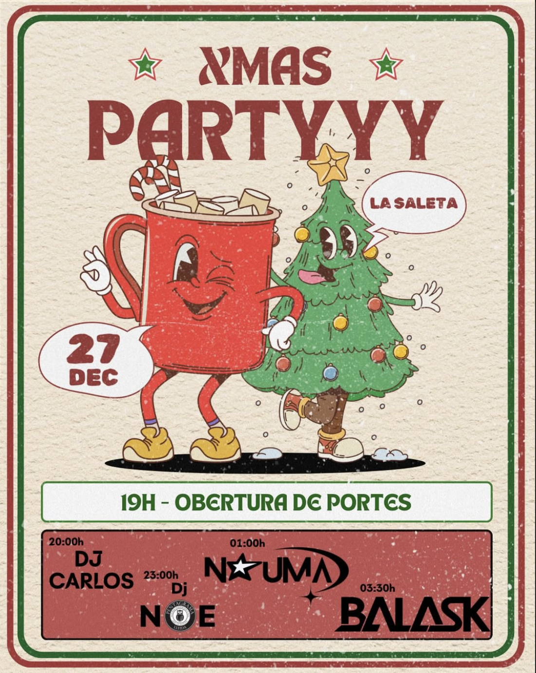 Arrencarem la festa amb un tardeo conduït per DJ Carlos. La nit continuarà amb la DJ Noe, que ens farà reviure grans temes dels anys 80 i 90. Seguidament prendrà el relleu DJ Nauma, i tancarem la vetllada amb Balask.
