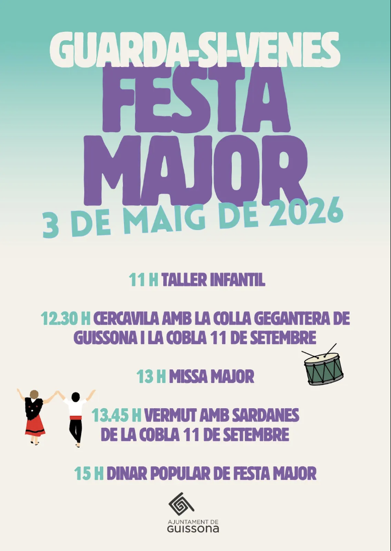 11.00 h: Taller infantil12.30 h: Cercavila amb la colla gegantera de Guissona i la Cobla 11 de Setembre13.00 h: Missa major13.45 h: Vermut amb sardanes amb la Cobla 11 de Setembre15.00 h: Dinar popular de Festa Major