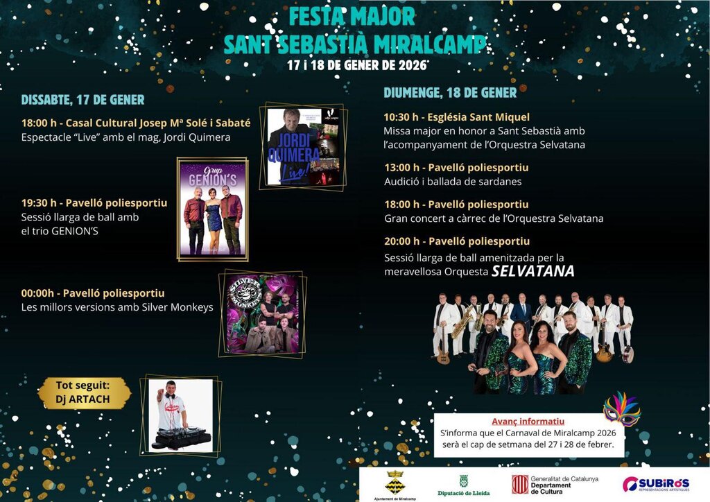 La Festa Major de Sant Sebastià de Miralcamp se celebrarà els dies 17 i 18 de gener de 2026, amb activitats culturals, musicals i tradicionals concentrades principalment al Casal Cultural i al Pavelló poliesportiu.