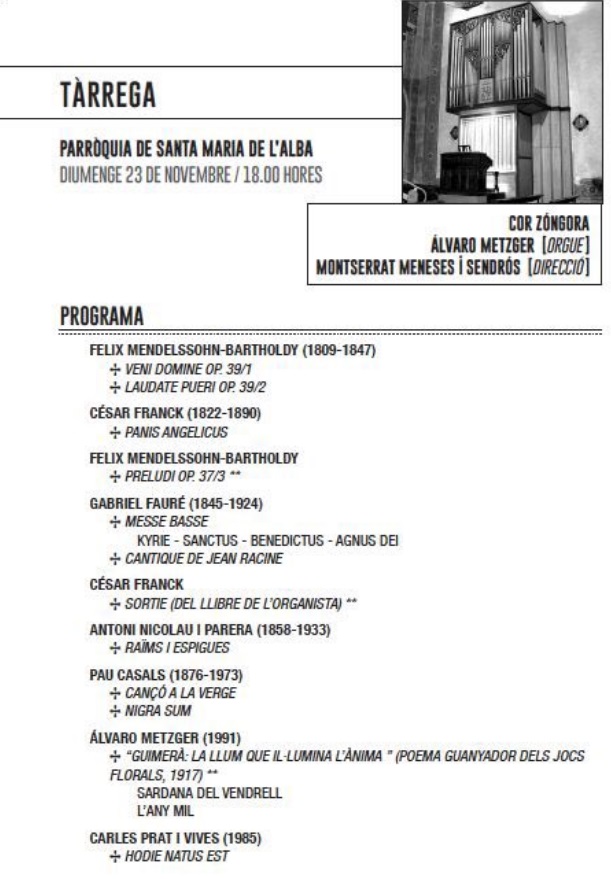 Activitats familiars · Concerts · Música · Trobada · Cicles Festival d'Orgues. Concert de l' Álvaro Metzger i de la coral femenina Cor Zóngora 23 de novembre. 18.00. Església de Santa Maria de l’Alba de Tàrrega. Actuació de l’organista Álvaro Metzger i de la coral femenina Cor Zóngora