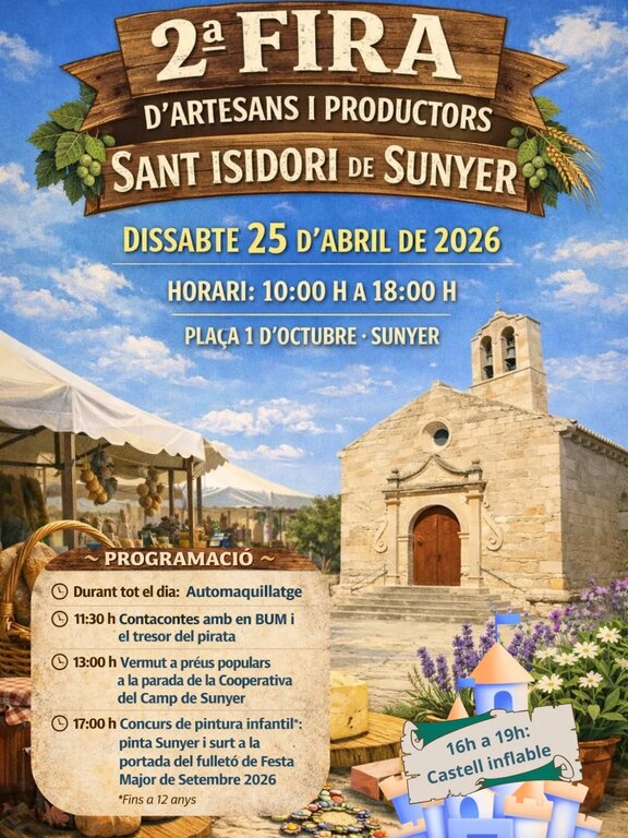 Programa: 10:00 – 18:00 – Fira d’artesans i productors (Plaça 1 d’Octubre) Durant tot el dia – Automaquillatge 11:30 – Contacontes “BUM i el tresor del pirata” 13:00 – Vermut popular 17:00 – Concurs de pintura infantil 16:00 – 19:00 – Castell inflable