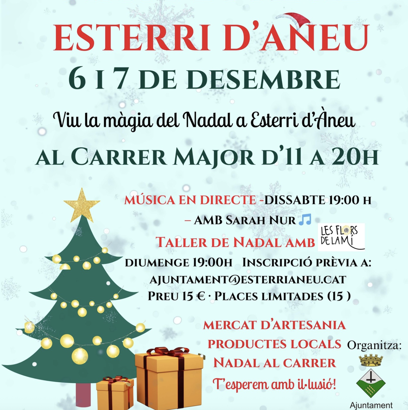 Els dies 6 i 7 de desembre, de les 11.00 a les 20.00 h, el Carrer Major d’Esterri d’Àneu acollirà diverses activitats nadalenques. El dissabte a les 19.00 h hi haurà música en directe amb Sarah Nur. El diumenge a les 19.00 h s’oferirà un taller de Nadal a càrrec de Les Flors de Lami, amb inscripció prèvia per correu electrònic, un preu de 15 euros i 15 places disponibles. Durant tots dos dies hi haurà un mercat d’artesania, productes locals i ambient nadalenc al carrer.