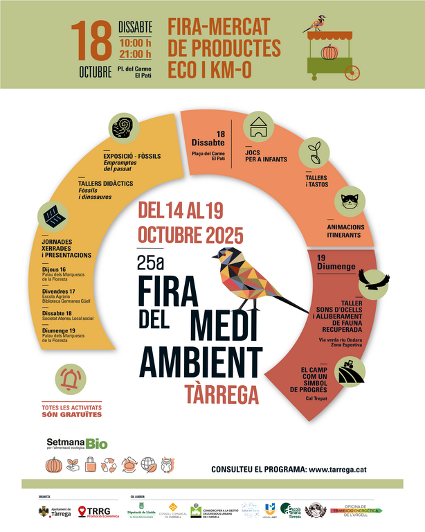 La Fira del Medi Ambient de Tàrrega assoleix la 25a edició. Organitzat per la Regidoria de Promoció Econòmica, i per segon any consecutiu, el certamen s’allargarà durant gairebé una setmana d’activitats, del 14 al 19 d'octubre. La capital de l’Urgell posa així el focus en la preservació i el coneixement del medi natural així com també en l’alimentació ecològica i de proximitat amb la voluntat alhora d’implicar públics de totes les edats. Les dates coincideixen a més amb la Setmana Bio que promou el Departament d’Agricultura, Ramaderia, Pesca i Alimentació de la Generalitat de Catalunya. La programació es desenvoluparà en diferents espais com la plaça del Carme, el Palau dels Marquesos de la Floresta, la Biblioteca Germanes Güell, el local de la Societat Ateneu, la Via Verda i el Museu Trepat.