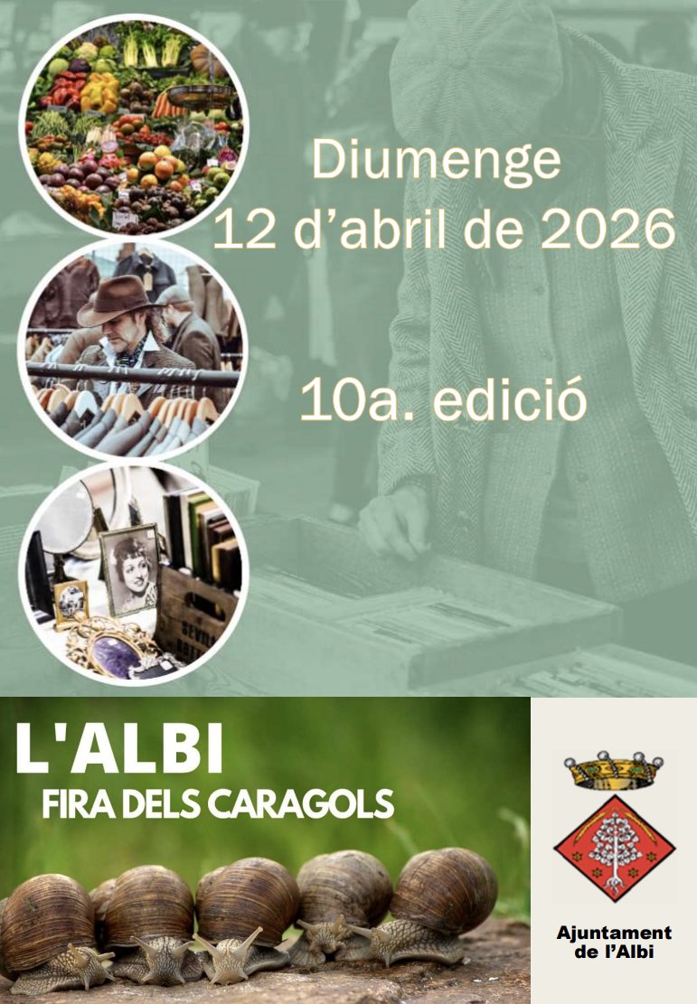 La Fira dels Caragols de l’Albi, que se celebra el 12 d’abril, arrenca a les 09.00 h amb esmorzar popular i servei de barra durant tot el dia. A les 09.30 h s’inicia la fira al nucli antic.