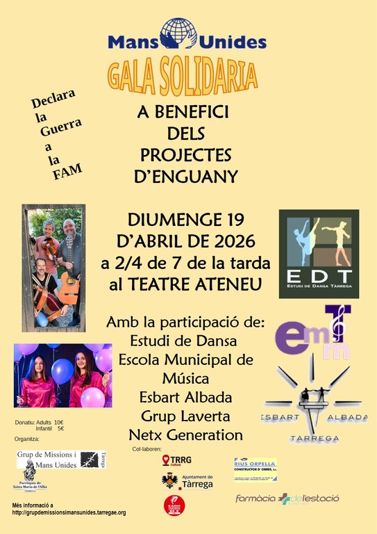 El Grup de Missions i Mans Unides de Tàrrega organitza una nova edició de la seva gala solidària amb música, dansa i màgia a benefici de projectes humanitaris a Rwanda i Brasil. Hi actuaran l'Estudi Dansa Tàrrega, l'Escola Municipal de Música, l'Esbart Albada, el grup Laverta i la màgia de Next Generation.