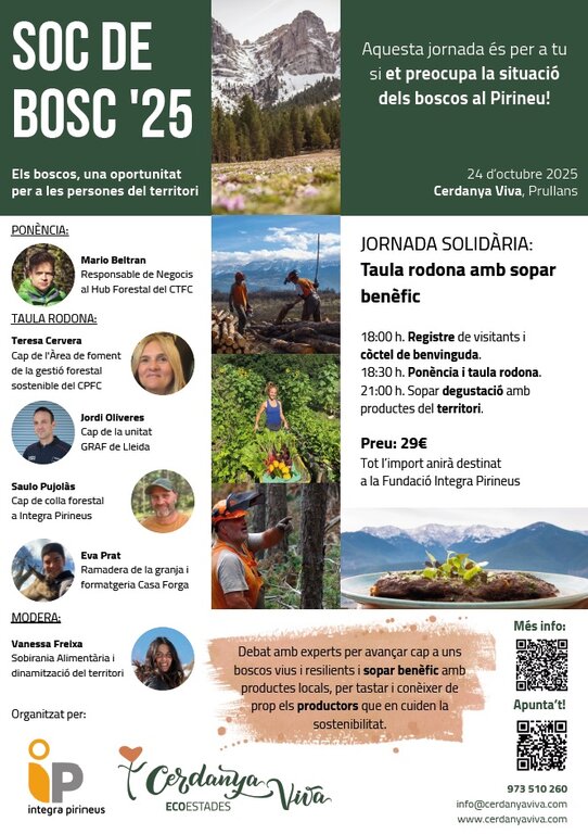 Debat amb experts per avançar cap a uns boscos vius i resilients i sopar benèfic amb productes locals, per tastar i conèixer de prop els productors que en cuiden la sostenibilitat.