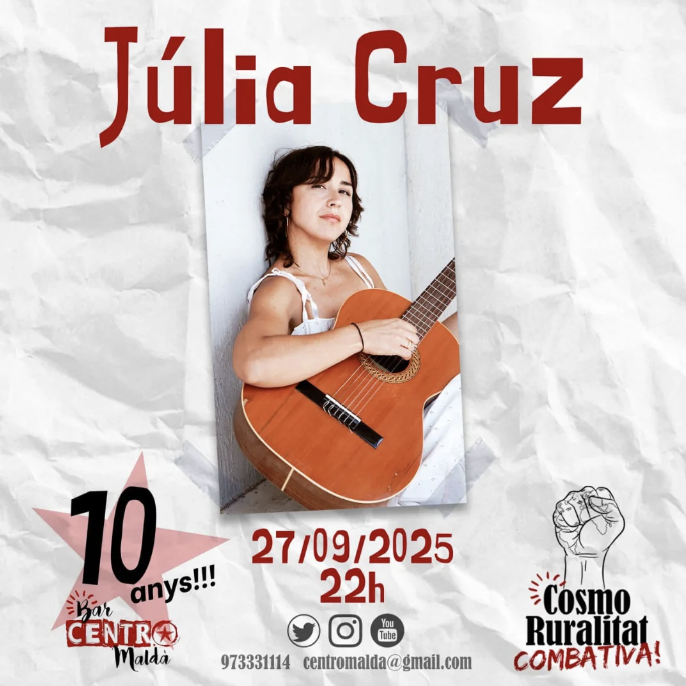 La fragatina Júlia Cruz Sesé (1993) és cantant, actriu i professora de música. Formada a l’Aula de Teatre de Lleida, a l’Institut del Teatre de Barcelona i al Taller de Músics, ha anat construint una trajectòria marcada per la fusió d’estils i llengües.