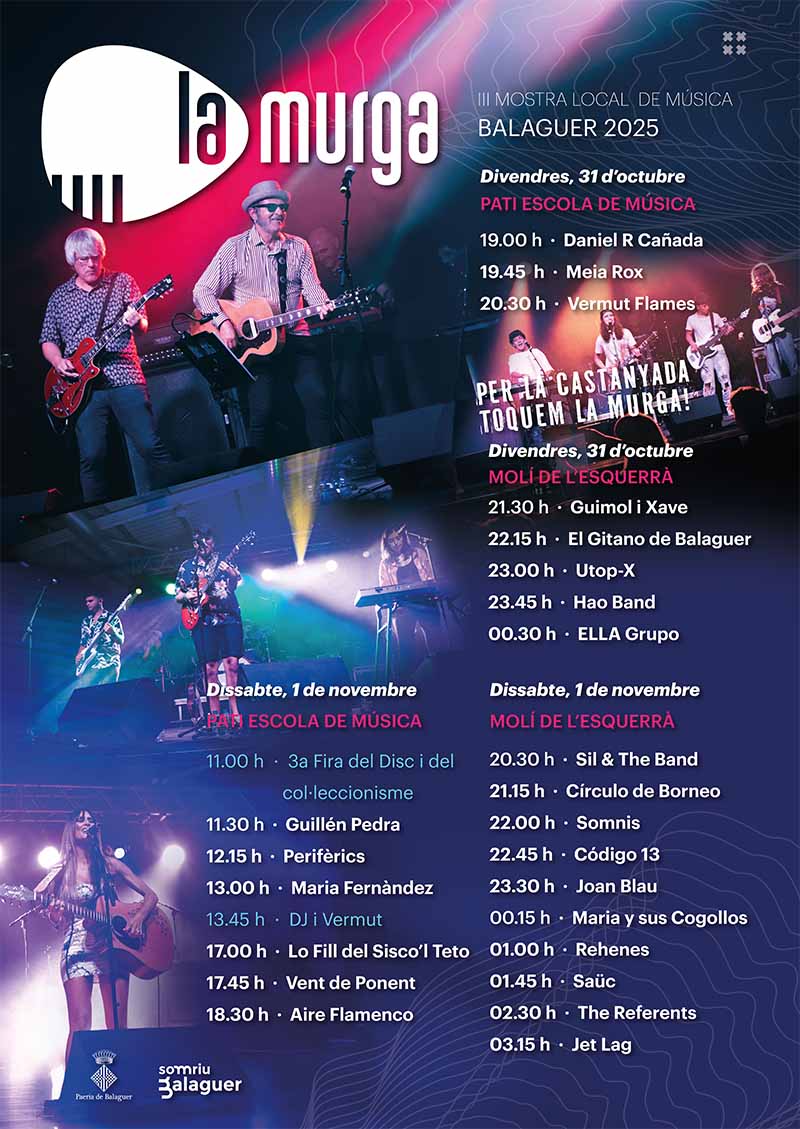 Molí de l’Esquerrà: Guimol i Xave (21.30 h), El Gitano de Balaguer (22.15 h), Utop-X (23.00 h), Hao Band (23.45 h) i ELLA Grupo (00.30 h).