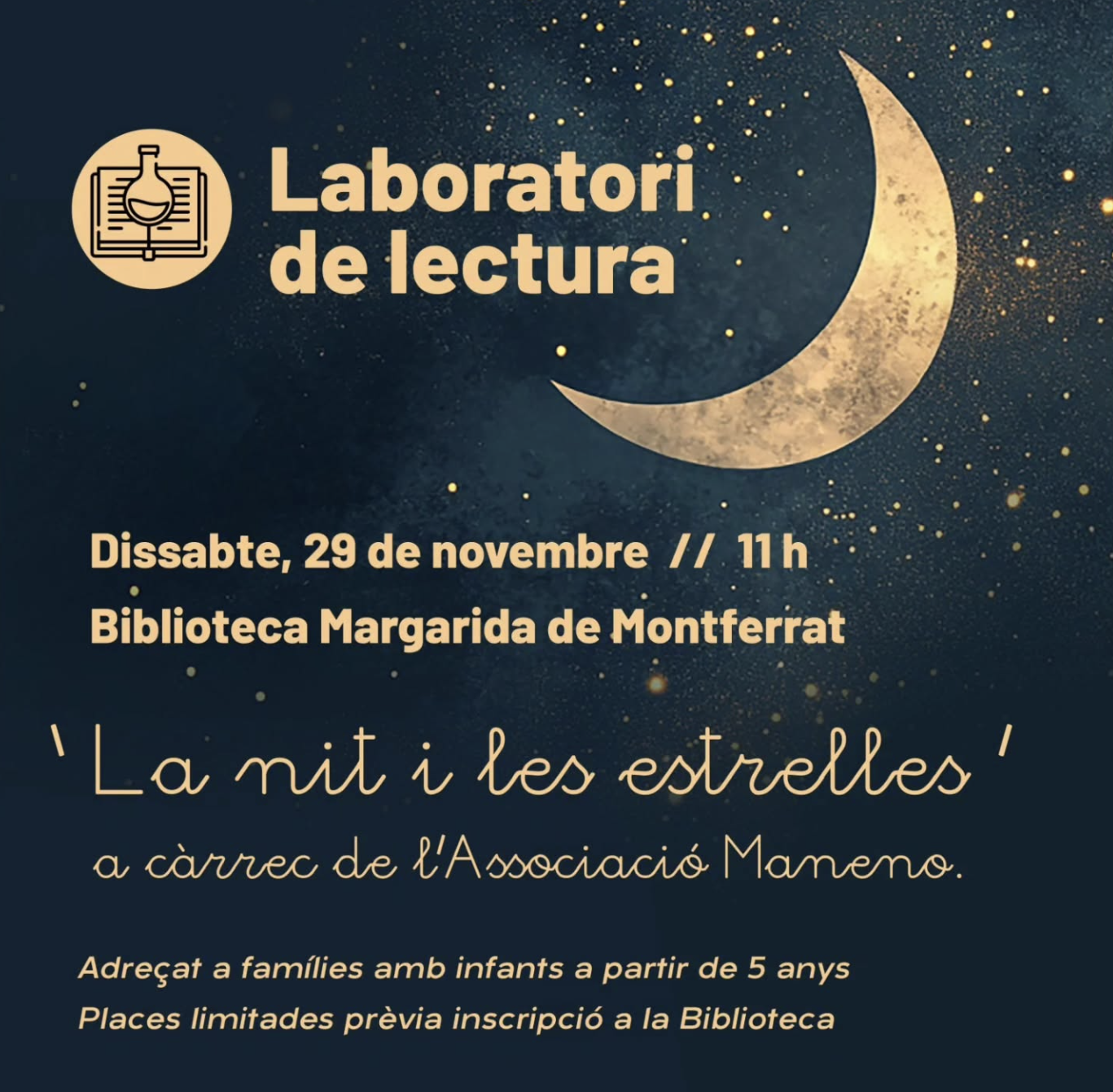 La Biblioteca Margarida de Montferrat organitza el dissabte 29 de novembre, a les 11 h, un nou Laboratori de Lectura titulat La nit i les estrelles. L’activitat, conduïda per l’Associació Maneno, s’adreça a famílies amb infants a partir de 5 anys. Les places són limitades i cal inscripció prèvia a la biblioteca.