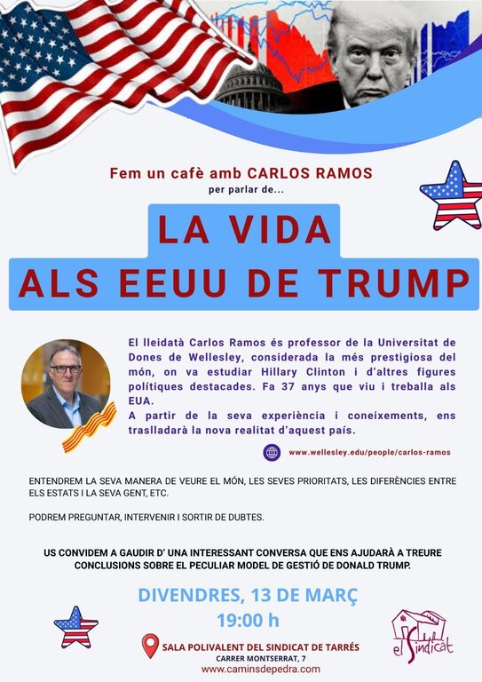 El Sindicat de Tarrés acull un cafè-col·loqui amb el professor i escriptor lleidatà Carlos Ramos, establert als EUA des de fa 37 anys. Ramos explicarà la seva experiència en aquest país i la nova realitat que viuen amb el peculiar model de gestió de l’actual president Donald Trump. Carlos Ramos és professor de Literatura i Estudis Culturals a la Wellesley College, de Massachussets, universitat privada de dones on es va formar Hillary Clinton, entre moltes altres polítiques i personalitats de renom mundial.