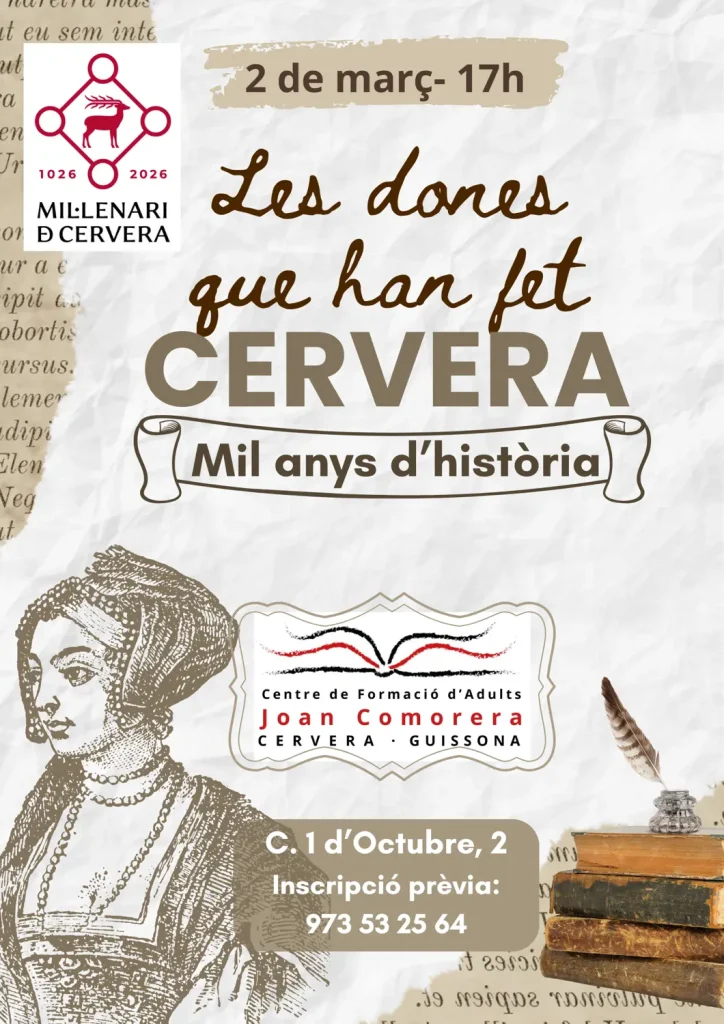 La conferència, a càrrec de Núria Ferré, s’emmarca dins de la celebració del Mil·lenari de Cervera i de la commemoració del Dia Internacional de les Dones (8 de març).