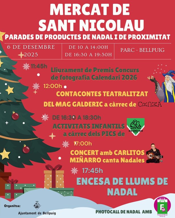 A les 11.45 h tindrà lloc el lliurament de premis del concurs de fotografia del Calendari 2026. A les 12.00 h hi haurà un contacontes teatralitzat del Mag Galderic. De 16.30 a 18.30 h s’oferiran activitats infantils a càrrec dels PICS de l’Agrupament Escolta i Guia. A les 17.00 h hi haurà un concert amb Carlitos Miñarro, que cantarà nadales. A les 17.45 h es farà l’encesa de llums de Nadal.