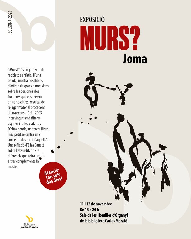 La mostra Murs?, de Joma, exposada a la biblioteca Carles Morató, l'integren tres llibres d'artista i un missatge del pensador Elias Canetti sobre els altres. L'autor serà present a la instal·lació, on hi farà una breu explicació del projecte.