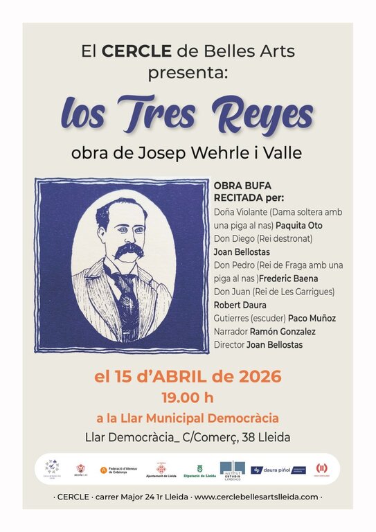Teatre Obra recitada 'Los tres reyes', de Joseph Werhle i Valle, sota la direcció de Joan Bellostas Interpretada per Paquita Oto, Joan Bellostas, Frederic Baena, Ramon Daura, Paco Muñoz i Ramon González