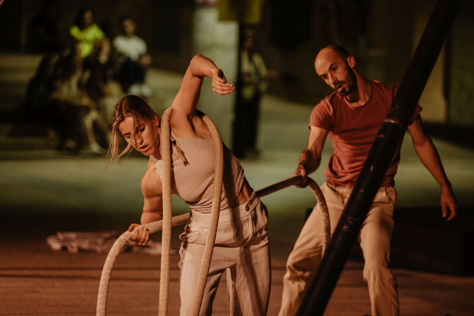 L’espectacle de la Cia Llumeü combina aeris de circ, malabars, dansa contemporània i teatre físic sobre l’escenari que s’ entrellacen en un diàleg entre un actor i acròbata de circ i una ballarina i actriu. L’obra casa llenguatges que també es muden a un nou univers híbrid i desconegut, mutant.