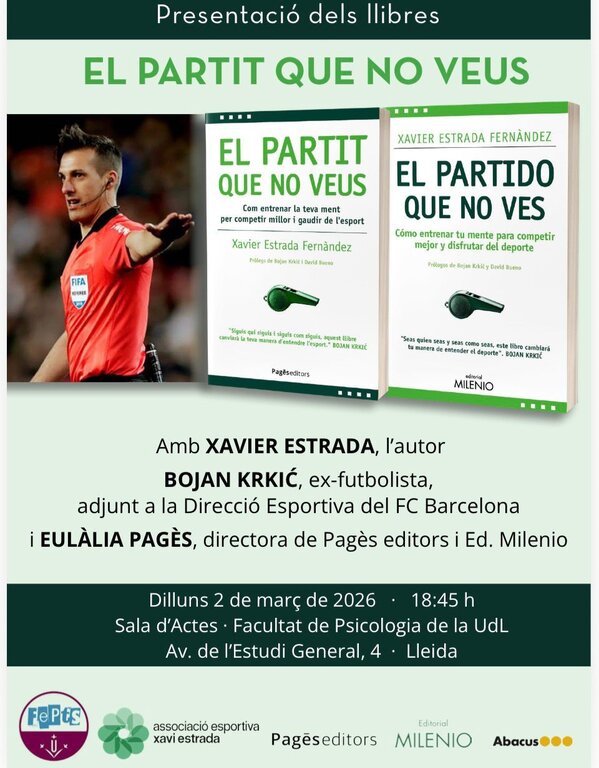 Presentacions Presentació del llibre 'El partit que no veus' / 'El partido que no ves' Amb l'autor, Xavier Estrada, Bojan Krkic, exfutbolista i Eulàlia Pàges. de Pagés Editors