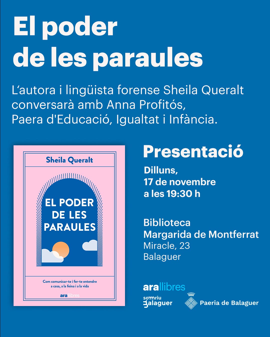 Presentacions Presentació del llibre 'El poder de les paraules', de Sheila Queralt L'autora conversarà amb Anna Profitós, Paera d'Educació, Igualtat i Infància