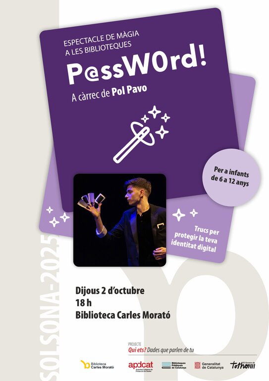La biblioteca Carles Morató de Solsona proposa al públic d’entre 6 i 12 anys un espectacle de màgia que, de manera lúdica i interactiva, tracta la protecció de les dades personals, les bones pràctiques a les xarxes socials i fa una introducció a la intel·ligència artificial. Es titula P@ssW0rd! i el protagonitza el jove mag Pol Pavo.