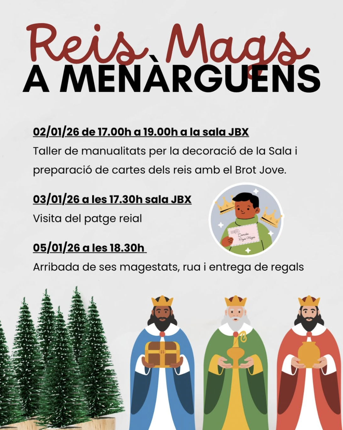 El programa Reis Mags a Menàrguens inclou diverses activitats nadalenques adreçades al públic familiar. El 2 de gener tindrà lloc un taller de manualitats per decorar la sala i preparar les cartes als Reis, amb la col·laboració del Brot Jove, a la sala JBX. El 3 de gener es farà la visita del patge reial, també a la sala JBX. Finalment, el 5 de gener tindrà lloc l’arribada de Ses Majestats, amb rua i entrega de regals.